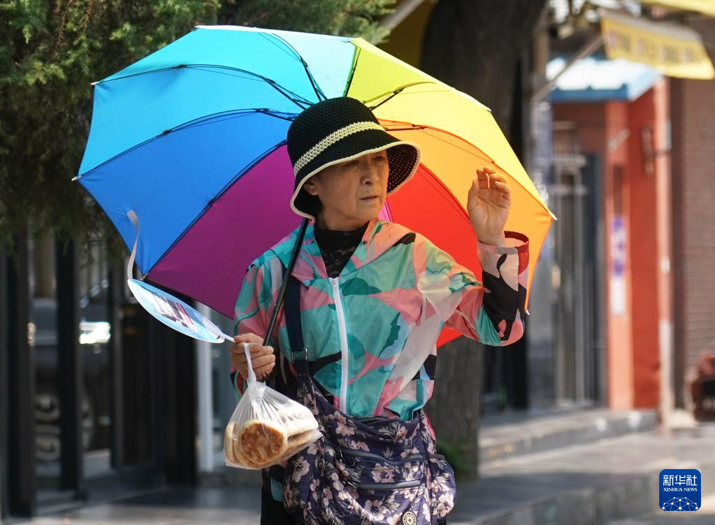 A woman walks on a street in Haidian District of Beijing, capital of China, June 23, 2023. Beijing issued a red alert for high temperature at 7 a.m. Friday. (Xinhua/Ren Chao)