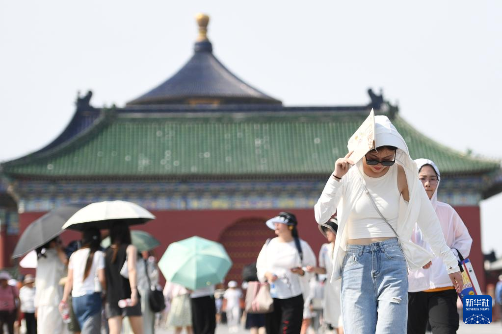 Tourists shield themselves from the sunshine with an umbrella at the Temple of Heaven in Beijing, capital of China, June 23, 2023. Beijing issued a red alert for high temperature at 7 a.m. Friday. (Xinhua/Ju Huanzong)