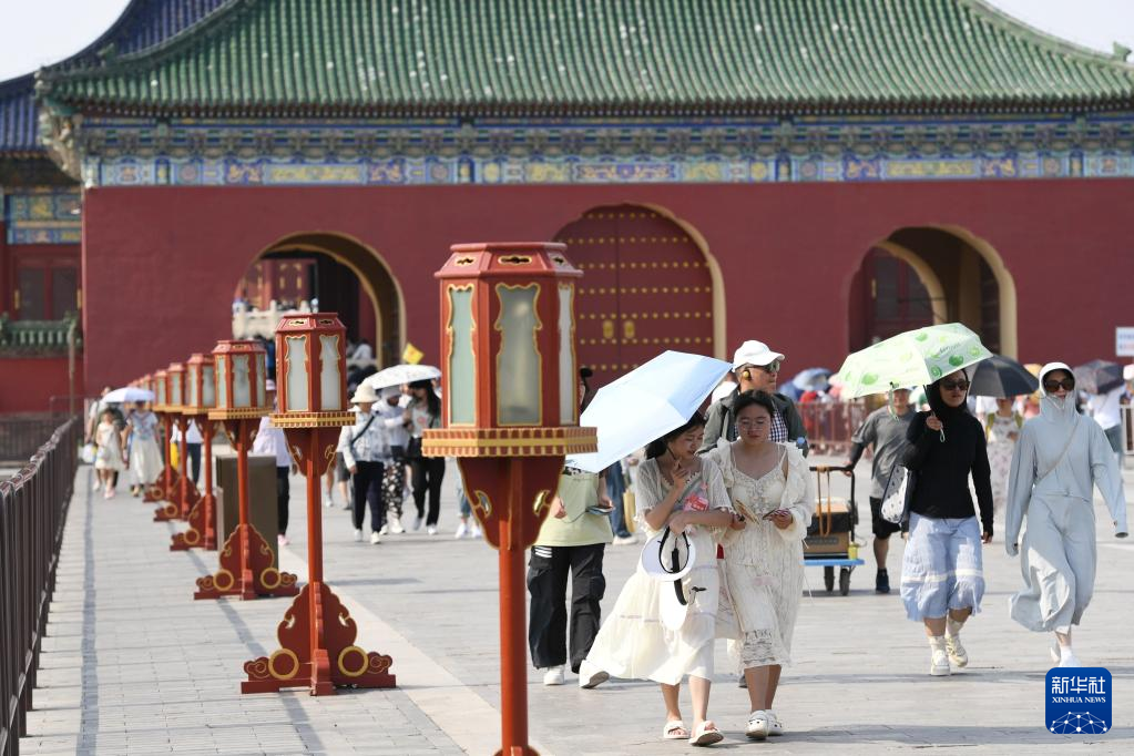 Tourists shield themselves from the sunshine with umbrellas at the Temple of Heaven in Beijing, capital of China, June 23, 2023. Beijing issued a red alert for high temperature at 7 a.m. Friday. (Xinhua/Ju Huanzong)