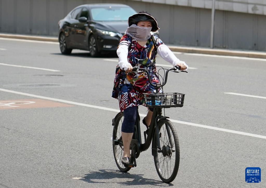 A woman rides a bicycle on a street in Haidian District of Beijing, capital of China, June 23, 2023. Beijing issued a red alert for high temperature at 7 a.m. Friday. (Xinhua/Ren Chao)