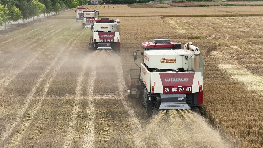 Agricultural machines harvest wheat in Ningyang County of Taian City, east China's Shandong Province, June 2, 2023. (Xinhua)