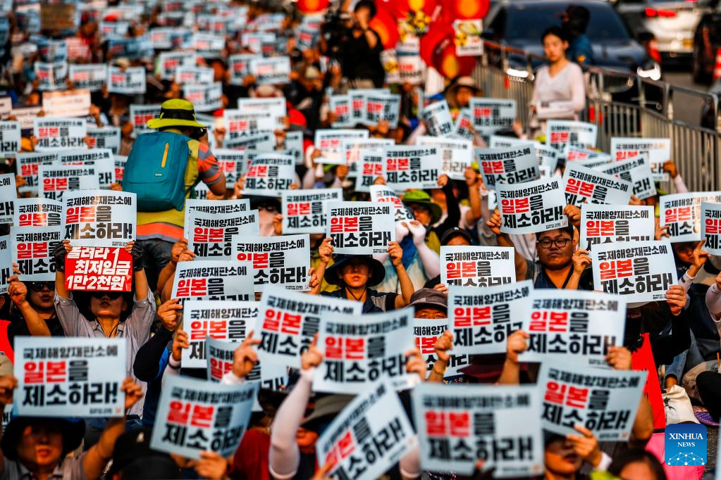 SEOUL, June 24 (Xinhua) -- Thousands of South Koreans rallied in central Seoul Saturday to urge the Japanese government to build more storage facilities on land for nuclear-contaminated water instead of discharging it into the sea.