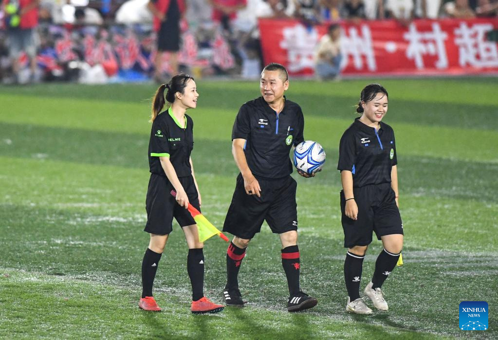Referees communicate with each other during a match of "Village Super League" in Rongjiang County of southwest China's Guizhou Province, June 23, 2023. "Village Super League", an amateur football tournament, has been dubbed "Cun Chao" by Chinese netizens, is being held in Rongjiang County. Organized and played by locals, its festive atmosphere and colorful ethnic culture captured the attention of media and social platforms. Many spectators travel from far and wide to watch games here on weekends, making the weekends even more joyful. (Xinhua/Yang Wenbin)