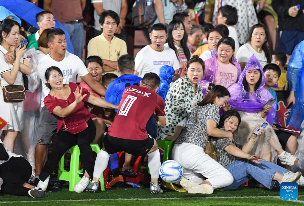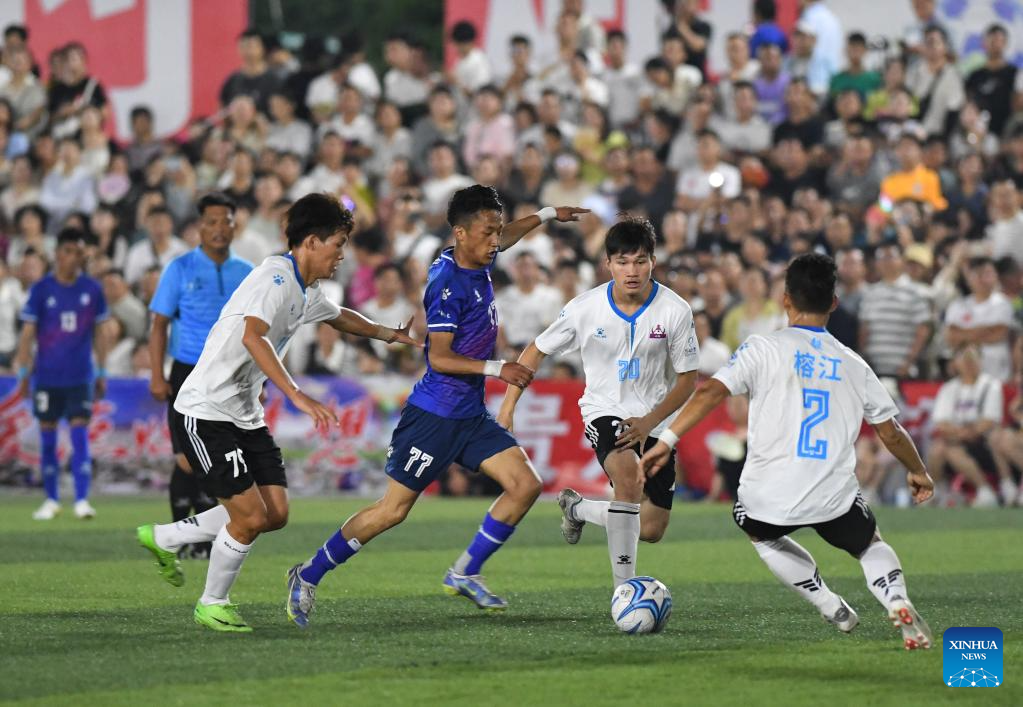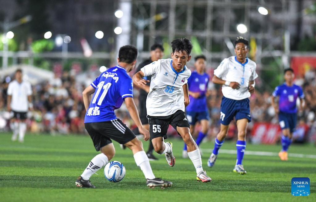 A player of team Rongjiang County vies with a player of team Guoluo Tibetan Autonomous Prefecture (front, L) during their friendly match of "Village Super League" in Rongjiang County of southwest China's Guizhou Province, June 23, 2023. "Village Super League", an amateur football tournament, has been dubbed "Cun Chao" by Chinese netizens, is being held in Rongjiang County. Organized and played by locals, its festive atmosphere and colorful ethnic culture captured the attention of media and social platforms. Many spectators travel from far and wide to watch games here on weekends, making the weekends even more joyful. (Xinhua/Yang Wenbin)