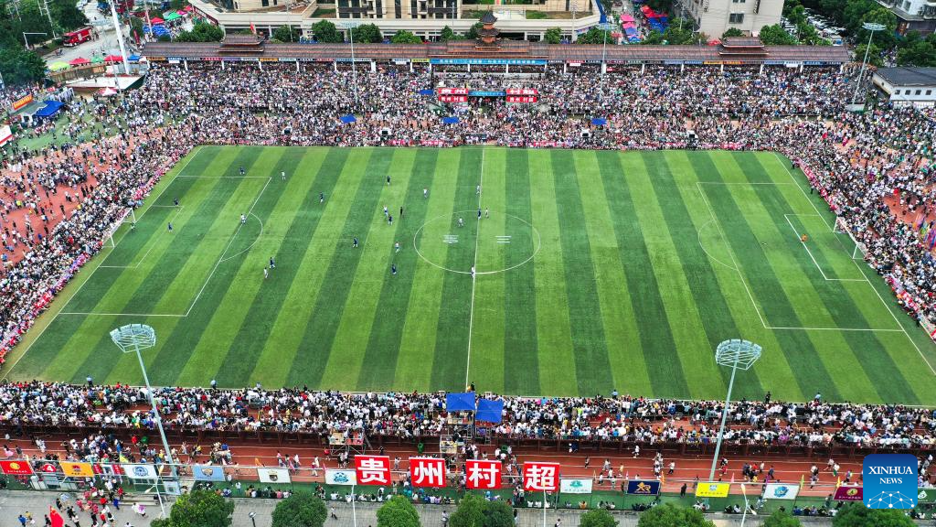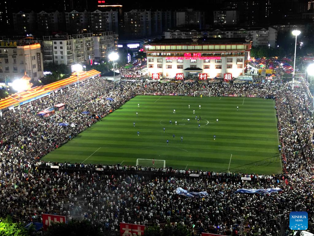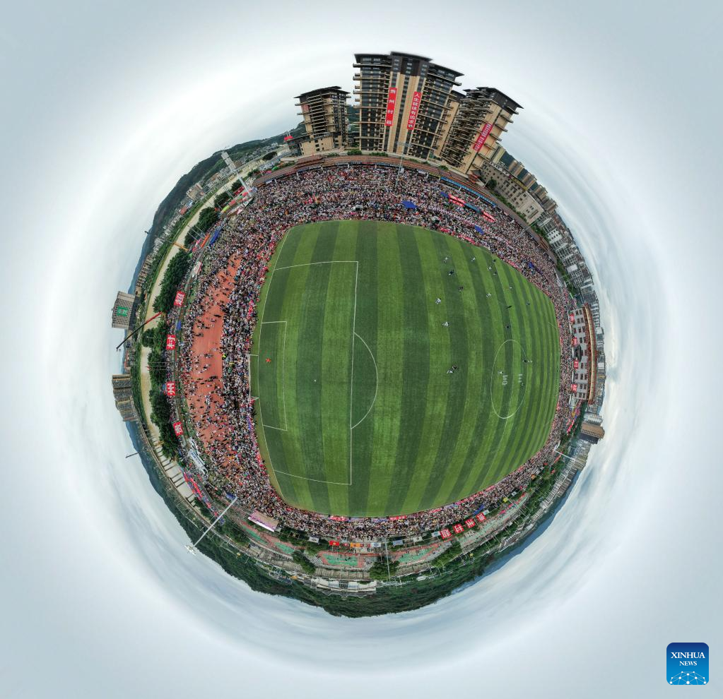 This aerial photo taken on June 23, 2023 shows the "Village Super League" in Rongjiang County of southwest China's Guizhou Province. "Village Super League", an amateur football tournament, has been dubbed "Cun Chao" by Chinese netizens, is being held in Rongjiang County. Organized and played by locals, its festive atmosphere and colorful ethnic culture captured the attention of media and social platforms. Many spectators travel from far and wide to watch games here on weekends, making the weekends even more joyful. (Xinhua/Yang Wenbin)