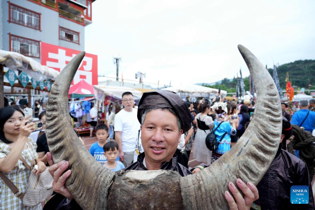 A performer carrying an ox horn enters the stadium during the "Village Super League" in Rongjiang County of southwest China's Guizhou Province, June 23, 2023. "Village Super League", an amateur football tournament, has been dubbed "Cun Chao" by Chinese netizens, is being held in Rongjiang County. Organized and played by locals, its festive atmosphere and colorful ethnic culture captured the attention of media and social platforms. Many spectators travel from far and wide to watch games here on weekends, making the weekends even more joyful. (Photo by Wang Bingzhen/Xinhua)