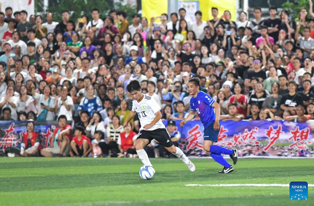 A player of team Rongjiang County (L) vies with a player of team Guoluo Tibetan Autonomous Prefecture during their friendly match of "Village Super League" in Rongjiang County of southwest China's Guizhou Province, June 23, 2023. "Village Super League", an amateur football tournament, has been dubbed "Cun Chao" by Chinese netizens, is being held in Rongjiang County. Organized and played by locals, its festive atmosphere and colorful ethnic culture captured the attention of media and social platforms. Many spectators travel from far and wide to watch games here on weekends, making the weekends even more joyful. (Xinhua/Yang Wenbin)