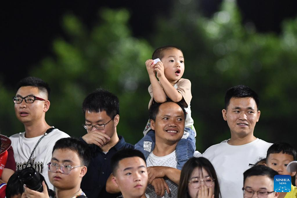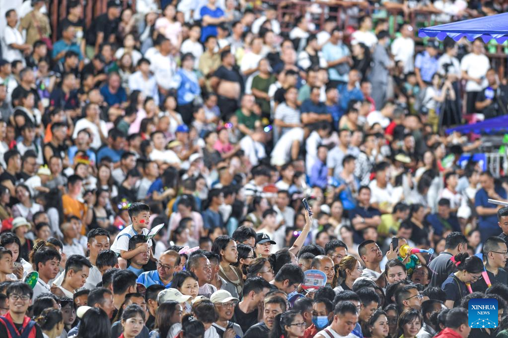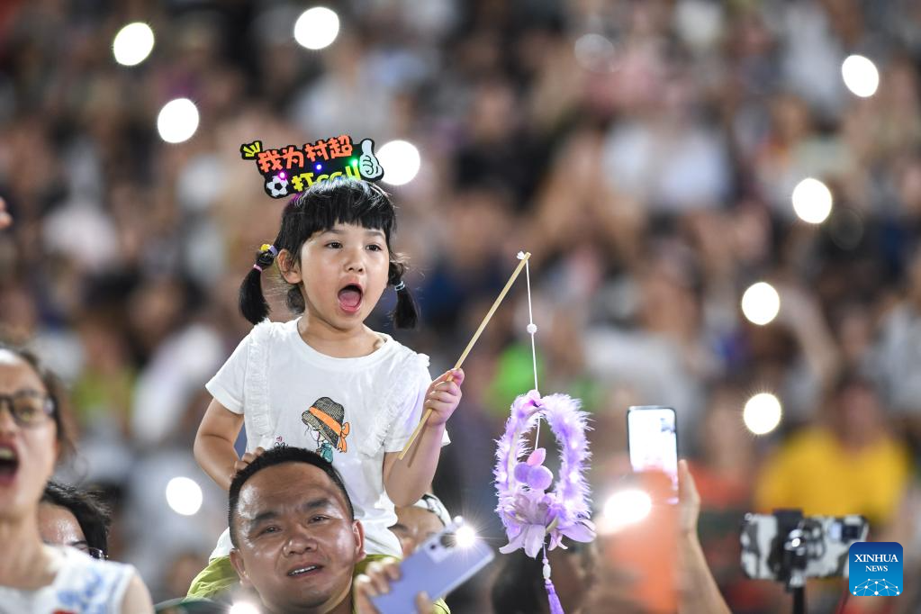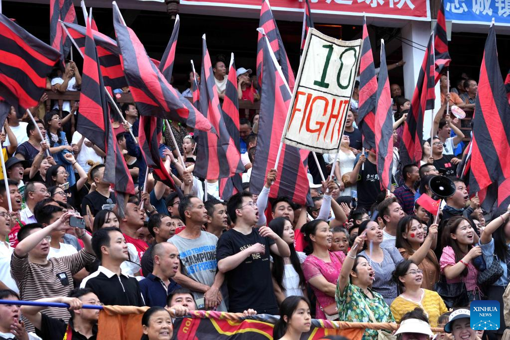 Spectators watch a match of "Village Super League" in Rongjiang County of southwest China's Guizhou Province, June 23, 2023. "Village Super League", an amateur football tournament, has been dubbed "Cun Chao" by Chinese netizens, is being held in Rongjiang County. Organized and played by locals, its festive atmosphere and colorful ethnic culture captured the attention of media and social platforms. Many spectators travel from far and wide to watch games here on weekends, making the weekends even more joyful. (Xinhua/Yang Wenbin)