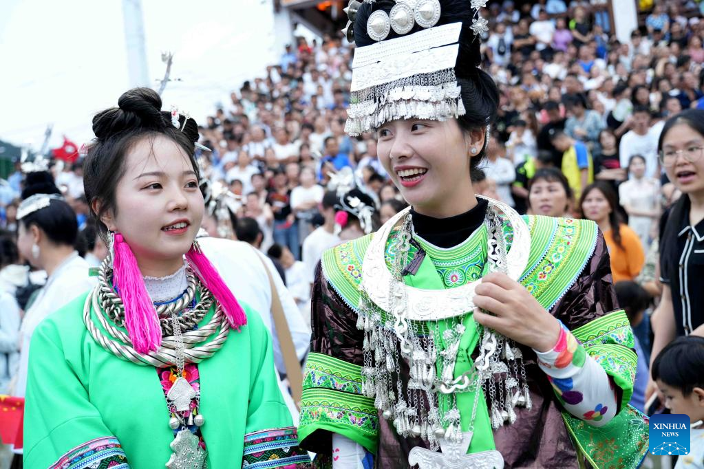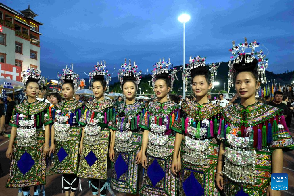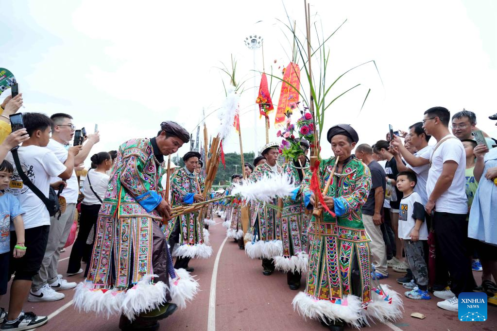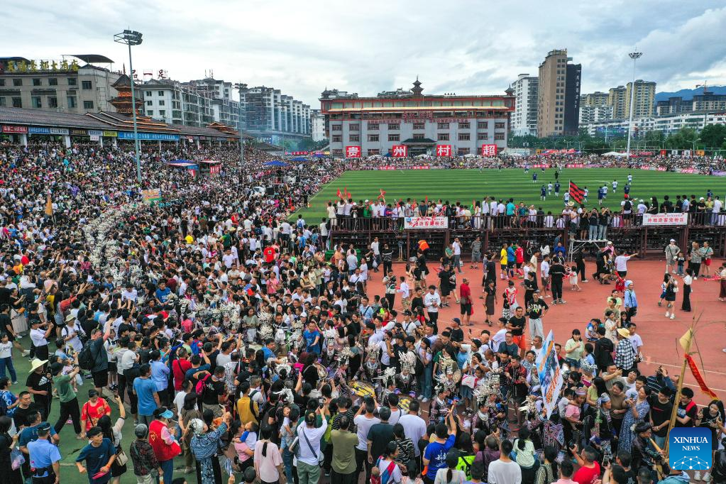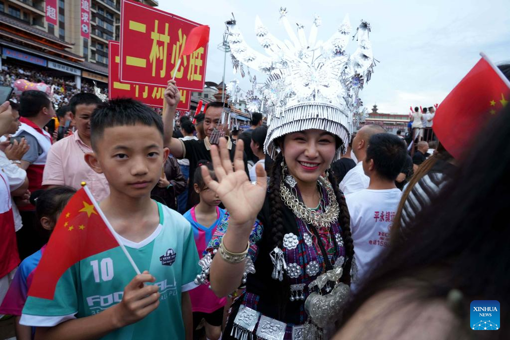 This aerial photo taken on June 23, 2023 shows performers' arrival during the "Village Super League" in Rongjiang County of southwest China's Guizhou Province. "Village Super League", an amateur football tournament, has been dubbed "Cun Chao" by Chinese netizens, is being held in Rongjiang County. Organized and played by locals, its festive atmosphere and colorful ethnic culture captured the attention of media and social platforms. Many spectators travel from far and wide to watch games here on weekends, making the weekends even more joyful. (Xinhua/Yang Wenbin)
