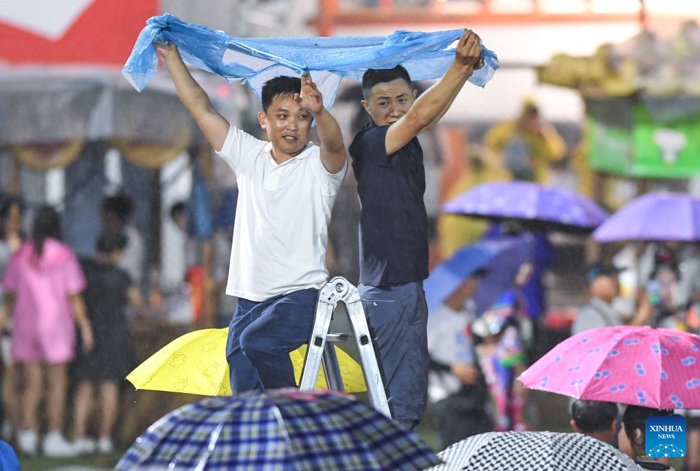 Spectators stand in the rain to watch a match of "Village Super League" in Rongjiang County of southwest China's Guizhou Province, June 23, 2023. "Village Super League", an amateur football tournament, has been dubbed "Cun Chao" by Chinese netizens, is being held in Rongjiang County. Organized and played by locals, its festive atmosphere and colorful ethnic culture captured the attention of media and social platforms. Many spectators travel from far and wide to watch games here on weekends, making the weekends even more joyful. (Xinhua/Yang Wenbin)