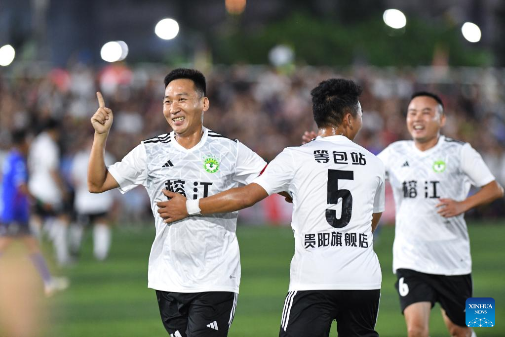 Players of team Rongjiang County celebrate scoring during a friendly match of "Village Super League" against team Guoluo Tibetan Autonomous Prefecture in Rongjiang County of southwest China's Guizhou Province, June 23, 2023. "Village Super League", an amateur football tournament, has been dubbed "Cun Chao" by Chinese netizens, is being held in Rongjiang County. Organized and played by locals, its festive atmosphere and colorful ethnic culture captured the attention of media and social platforms. Many spectators travel from far and wide to watch games here on weekends, making the weekends even more joyful. (Xinhua/Yang Wenbin)