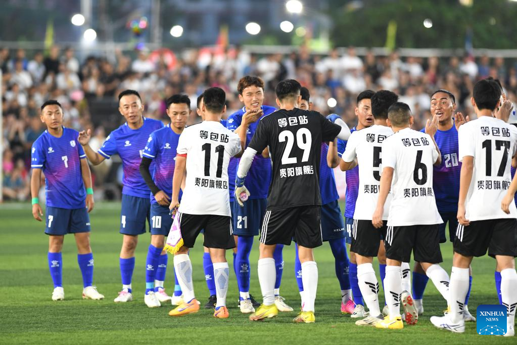 Players of team Rongjiang County (front) greet players of team Guoluo Tibetan Autonomous Prefecture prior to their friendly match of "Village Super League" in Rongjiang County of southwest China's Guizhou Province, June 23, 2023. "Village Super League", an amateur football tournament, has been dubbed "Cun Chao" by Chinese netizens, is being held in Rongjiang County. Organized and played by locals, its festive atmosphere and colorful ethnic culture captured the attention of media and social platforms. Many spectators travel from far and wide to watch games here on weekends, making the weekends even more joyful. (Xinhua/Yang Wenbin)