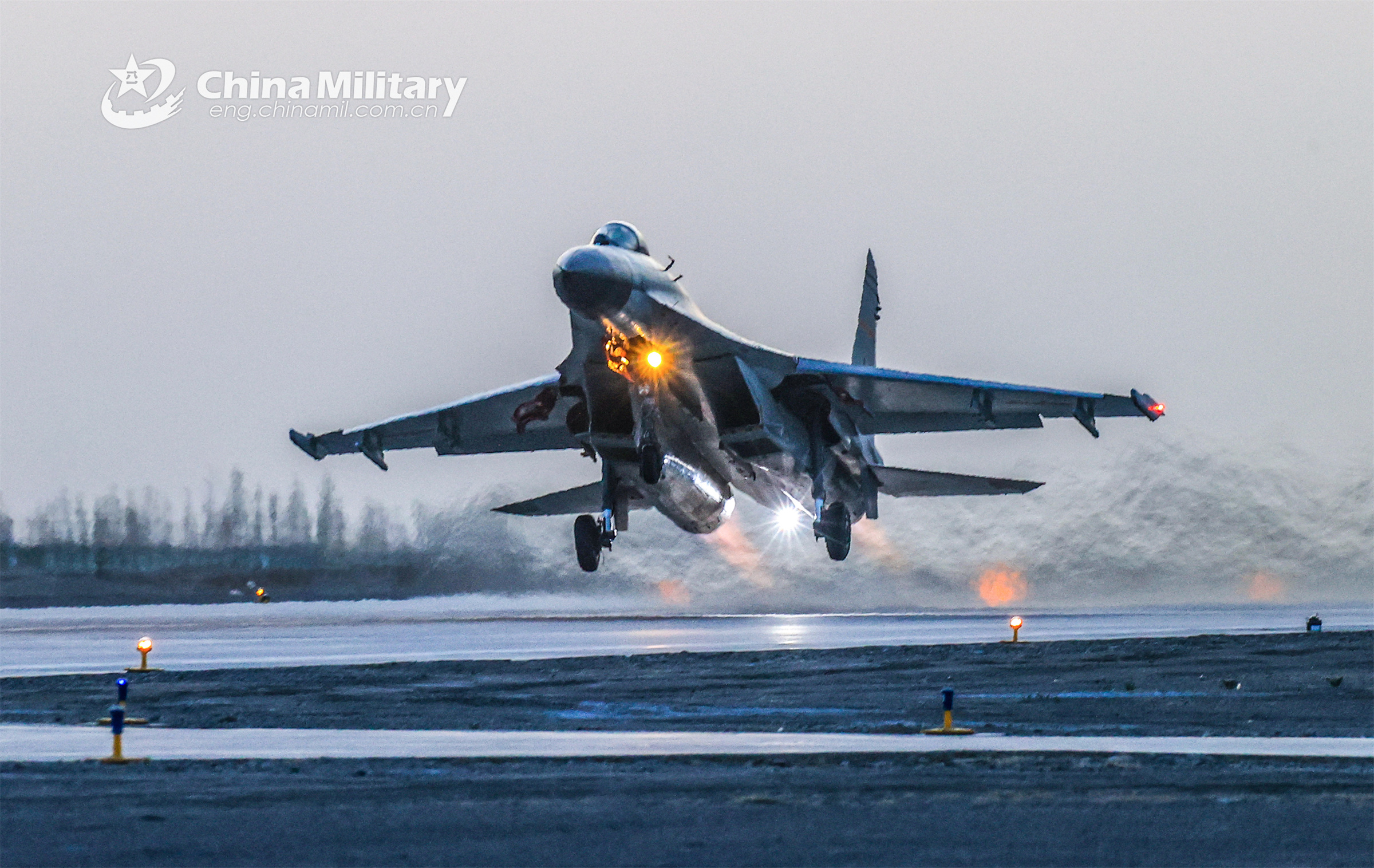 A fighter jet attached to a brigade of the PLA Air Force Xi'an Flying College takes off from the runway during a recent round-the-clock flight training exercise. (eng.chinamil.com.cn/Photo by Cui Baoliang)