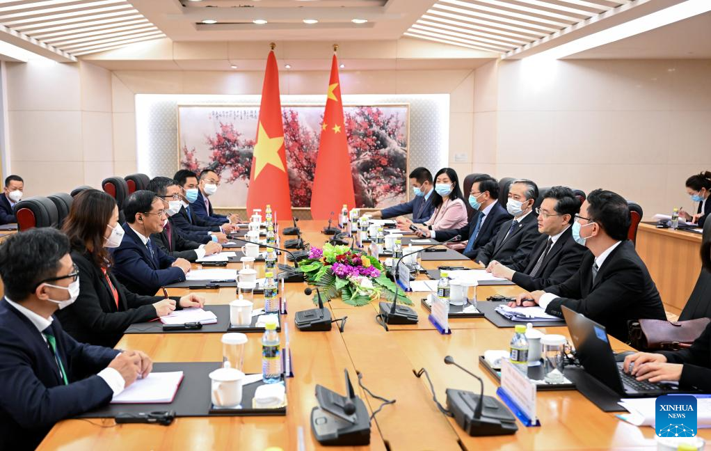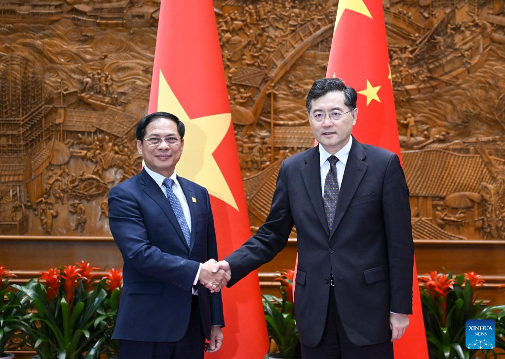 BEIJING, June 25 (Xinhua) -- Chinese State Councilor and Foreign Minister Qin Gang met with Vietnamese Foreign Minister Bui Thanh Son, who is accompanying the Prime Minister of Vietnam Pham Minh Chinh on his visit to China, on Sunday in Beijing.