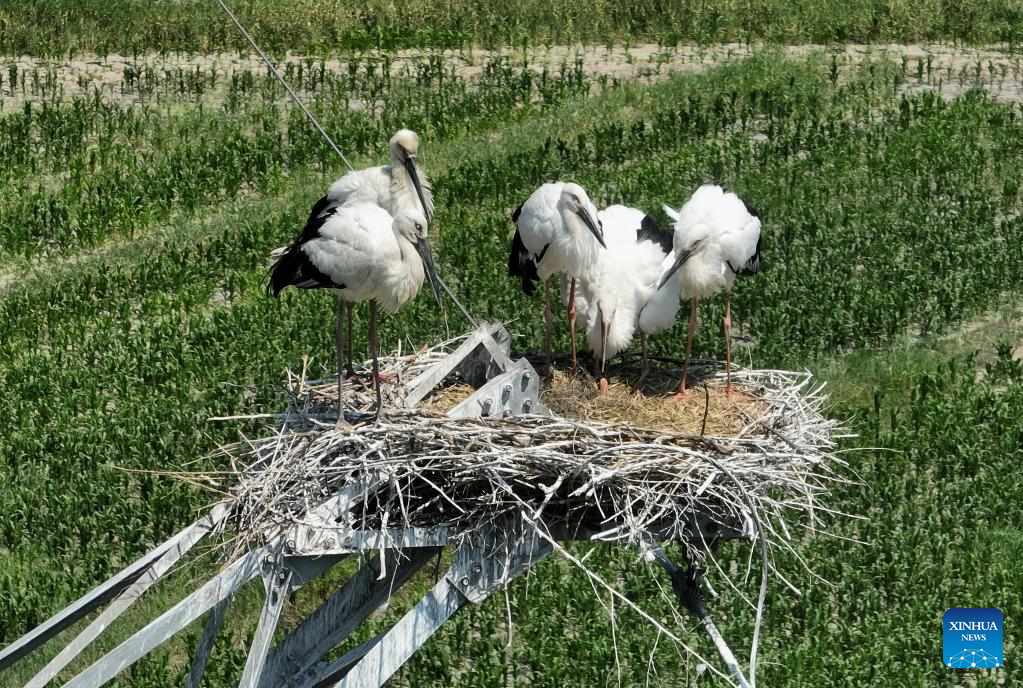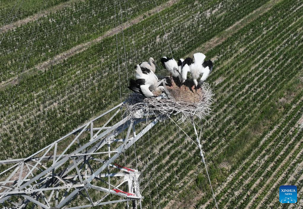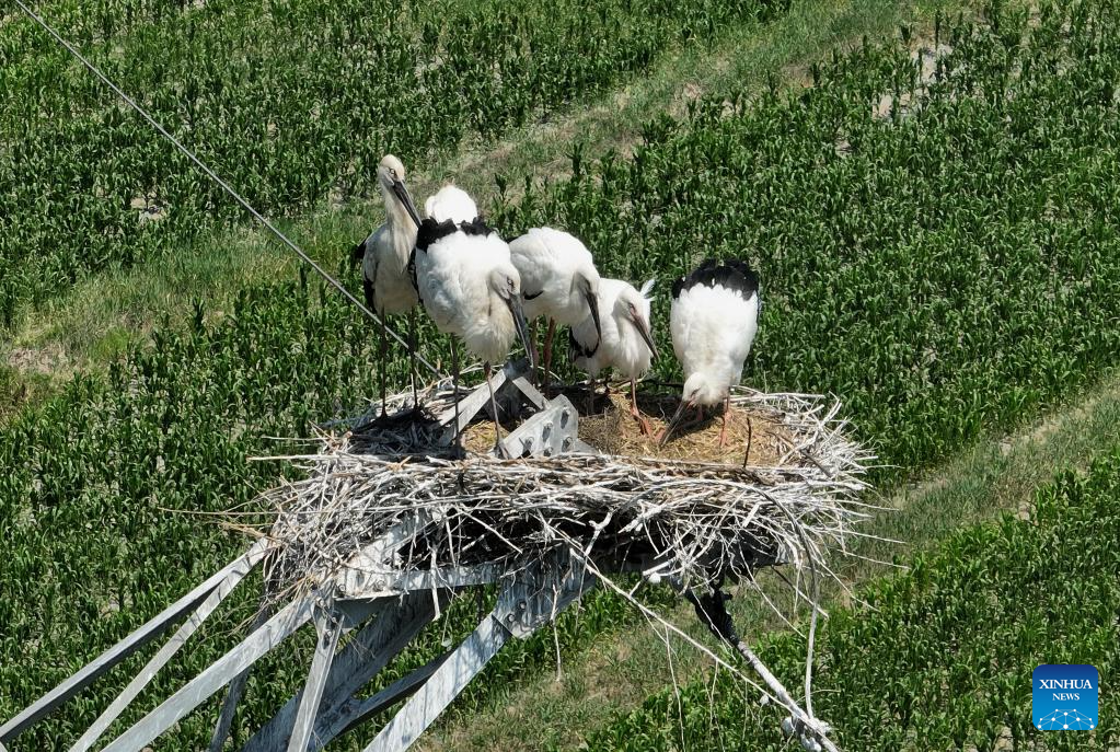 This photo taken with a drone on June 24, 2023 shows two full-grown oriental white storks (1st &2nd L) looking after their chicks in Heiyanzi Town of Fengnan District, Tangshan, north China's Hebei Province. (Xinhua/Yang Shiyao)