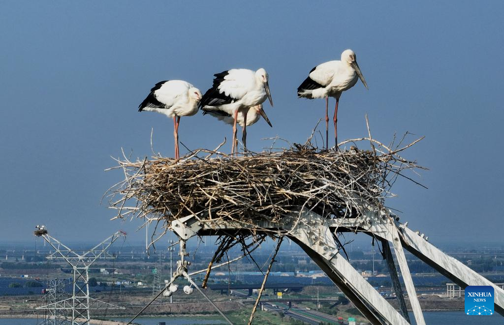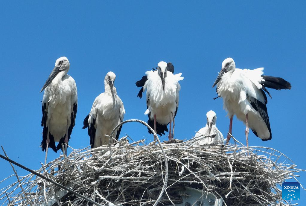 This photo taken with a drone on June 24, 2023 shows two full-grown oriental white storks (1st &2nd L) looking after their chicks in Heiyanzi Town of Fengnan District, Tangshan, north China's Hebei Province.?(Xinhua/Yang Shiyao)