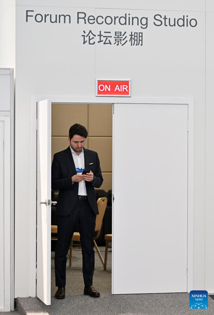 A staff member is seen at the Forum Recording Studio inside the Tianjin Meijiang Convention Center, the venue for the 14th Annual Meeting of the New Champions, also known as the Summer Davos Forum, in north China's Tianjin Municipality. (Xinhua/Li Ran)
