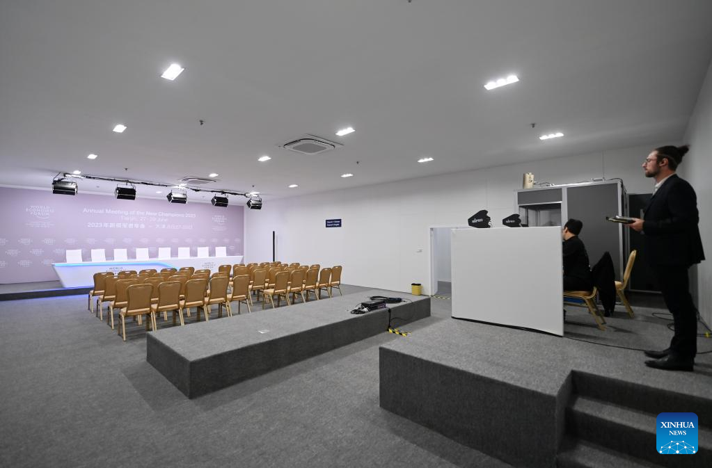 This photo taken on June 25, 2023 shows the Briefing Centre inside the Tianjin Meijiang Convention Center, the venue for the 14th Annual Meeting of the New Champions, also known as the Summer Davos Forum, in north China's Tianjin Municipality. (Xinhua/Li Ran)