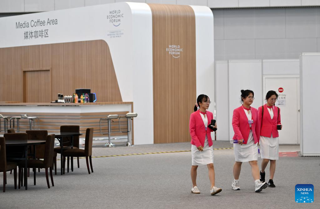 Volunteers are seen at the Media Village inside the Tianjin Meijiang Convention Center, the venue for the 14th Annual Meeting of the New Champions, also known as the Summer Davos Forum, in north China's Tianjin Municipality, June 25, 2023. (Xinhua/Li Ran)