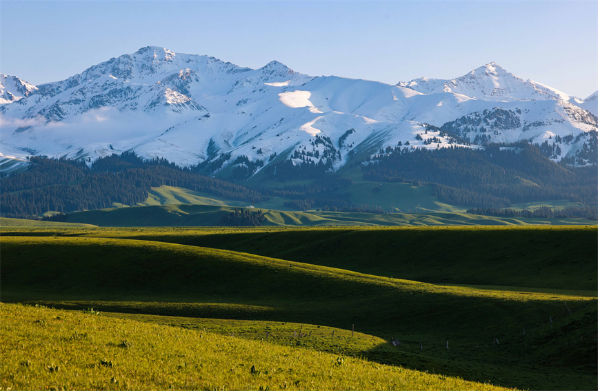 The Narat Grasslands in Xinyuan county, northwest China's Xinjiang Uygur Autonomous Region was full of vitality after rain. The warm sunshine, gentle breeze, green grass, blooming flowers and snow-covered mountains give the grasslands a feeling of tranquility.