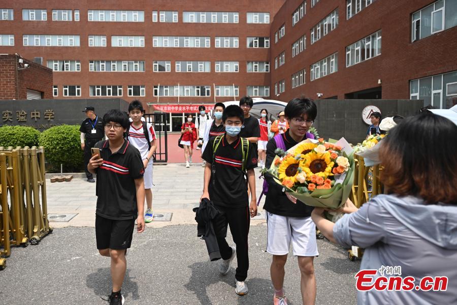 A student is greeted with a bouquet of flowers while walking out of an exam site at a high school in Beijing, June 26, 2023. (Photo: China News Service/Tian Yuhao)