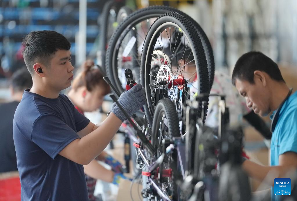 Staff members work at a workshop of a bicycle company in Lutai Economic Development Zone of Tangshan City, north China's Hebei Province, June 25, 2023. Lutai Economic Development Zone has upgraded its bicycle manufacturing sector and contributed to high-quality development in the regional economy in recent years. The annual output of the 46 bike-related enterprises in the zone has reached 5.5 billion yuan (about 761 million U.S. dollars). (Xinhua/Yang Shiyao)