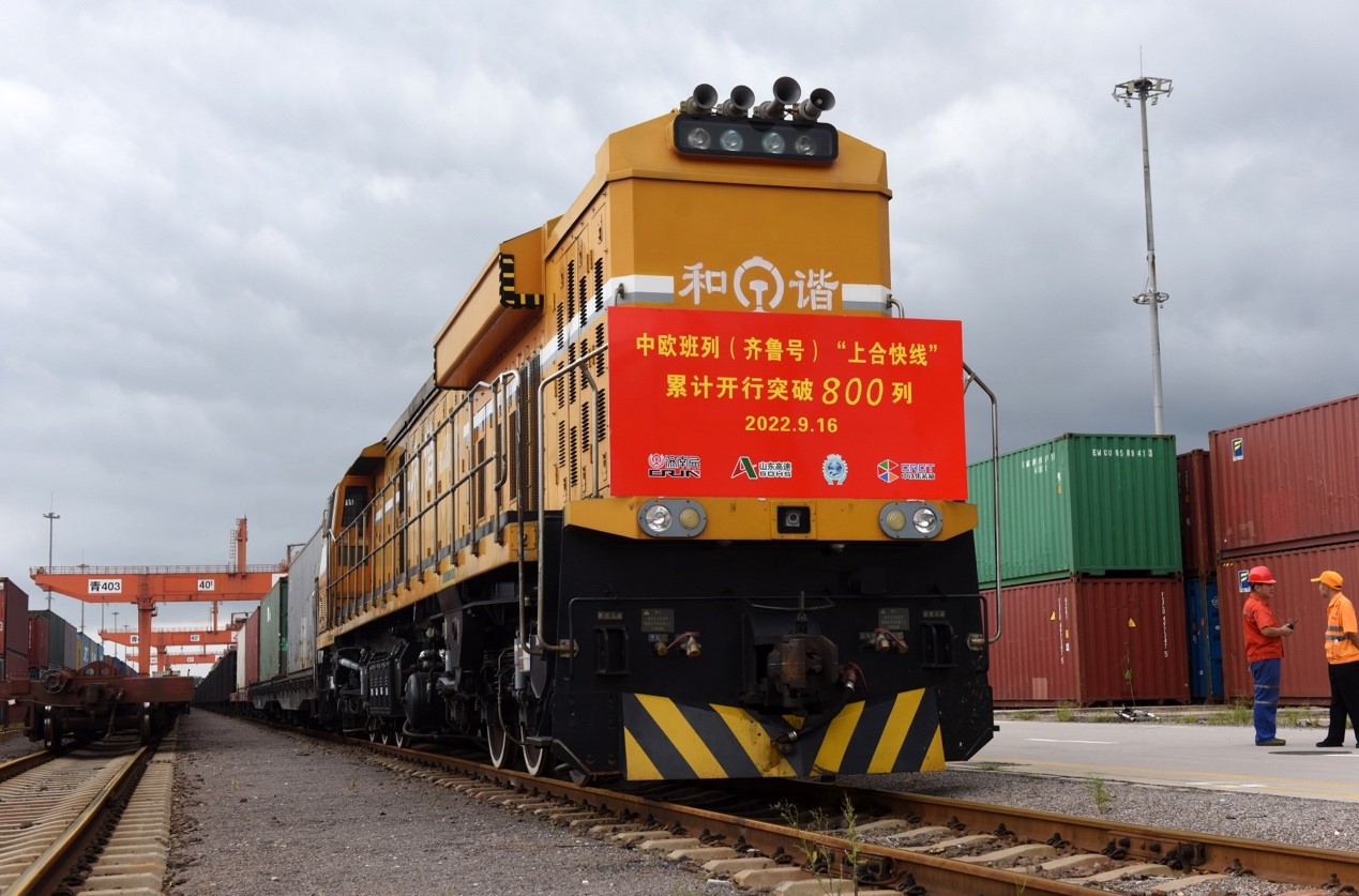 A China-Europe freight train loaded with various kinds of goods departs from the multimodal transport center in the China-Shanghai Cooperation Organization (SCO) Local Economic and Trade Cooperation Demonstration Area (SCODA) in Qingdao, east China's Shandong province, Sept. 16, 2022. It marks the cumulative number of "Qilu" China-Europe freight trains from the SCO zone exceeding 800 since it was launched in April 2020. (People's Daily Online/Wang Zhaomai)