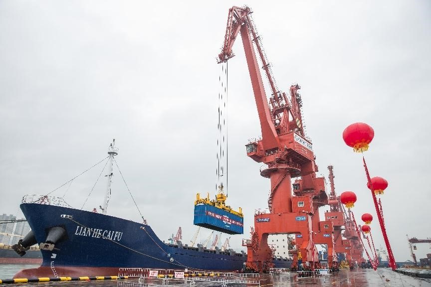 The first shipping route between the China-Shanghai Cooperation Organization (SCO) Local Economic and Trade Cooperation Demonstration Area in Qingdao, east China's Shandong province, and Russia's port city of Vladivostok is officially launched, Sept. 14, 2022. (People's Daily Online/Hou Fangchao)