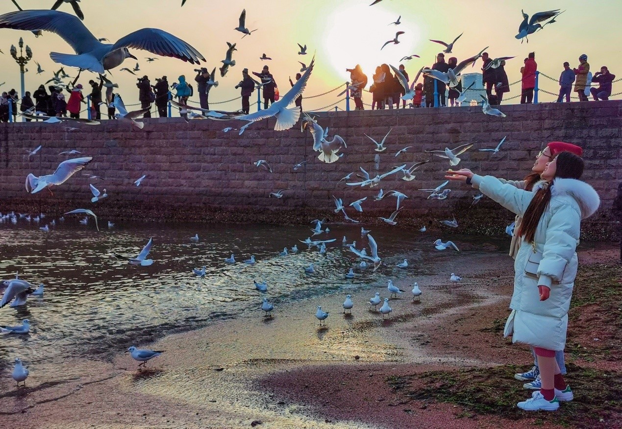 Sea gulls attract visitors at the Trestle Bridge in Qingdao city, east China's Shandong Province. (People's Daily Online/Shu Qing)
