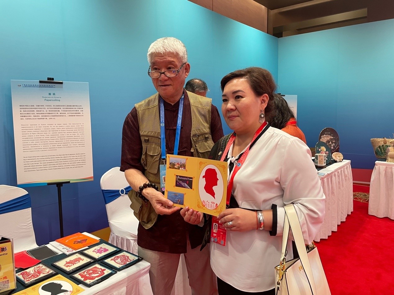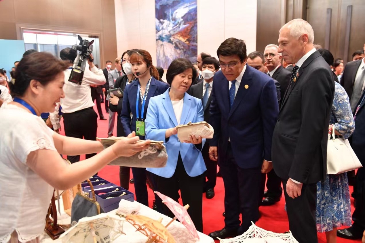 Guests watch works of inheritors of intangible cultural heritage at the Shanghai Cooperation Organization (SCO) Countries People-to-People Friendship and Friendship Cities Cooperation Achievements Exhibition during the SCO Forum on People-to-People Friendship and the Forum on Friendship Cities. (Photo provided by the SCO Committee on Good-Neighbourliness, Friendship and Cooperation)