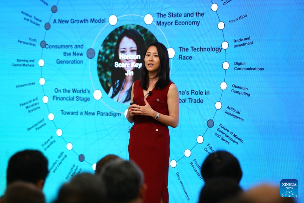 Jin Keyu, professor of economics at London School of Economics and Political Science in the United Kingdom, speaks during a session themed "Horizon Scan: China Future Trends" of the 14th Annual Meeting of the New Champions, also known as the Summer Davos, in Tianjin, north China, June 27, 2023. (Xinhua/Sun Weitong)