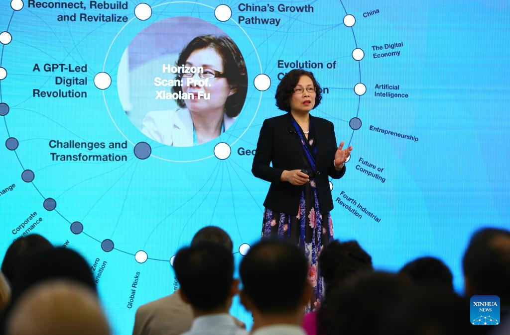 Fu Xiaolan (C), founding director of Technology and Management Centre for Development in University of Oxford of the United Kingdom, speaks during a session themed "Horizon Scan: China Future Trends" of the 14th Annual Meeting of the New Champions, also known as the Summer Davos, in Tianjin, north China, June 27, 2023. (Xinhua/Sun Weitong)