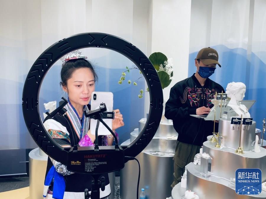 An embroiderer advertises her products during a livestream in a scenic zone in Guiyang, southwest China's Guizhou Province. (Xinhua/Zhou Xuanni)