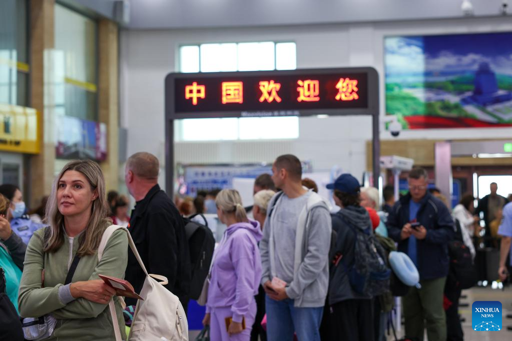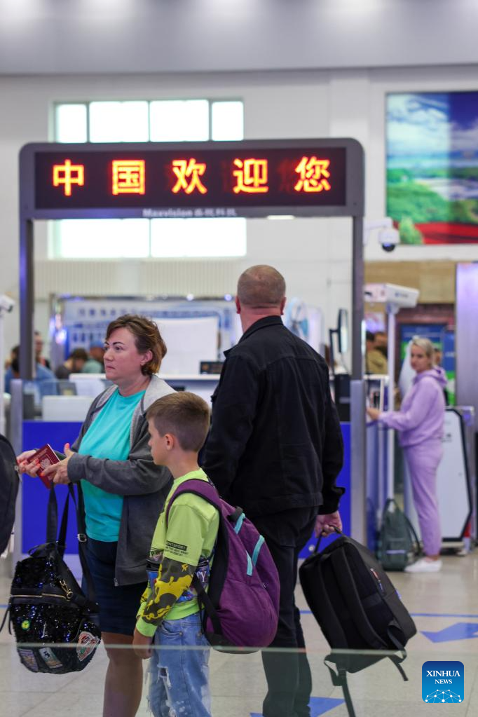 Travellers are pictured at the inbound hall of the highway port in Hunchun City, northeast China's Jilin Province, June 27, 2023. Hunchun borders Russia and the Democratic People's Republic of Korea, and serves as the only port city of Jilin Province to Russia. More than 73,000 counts of persons and over 16,000 counts of vehicles have passed through the Hunchun highway port so far this year. (Xinhua/Yan Linyun)