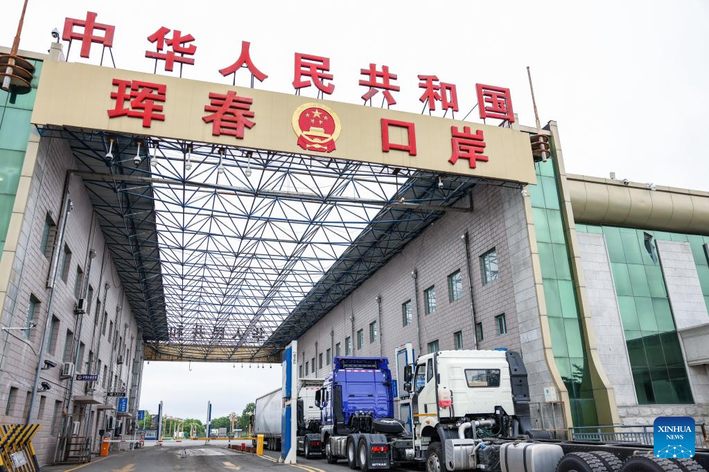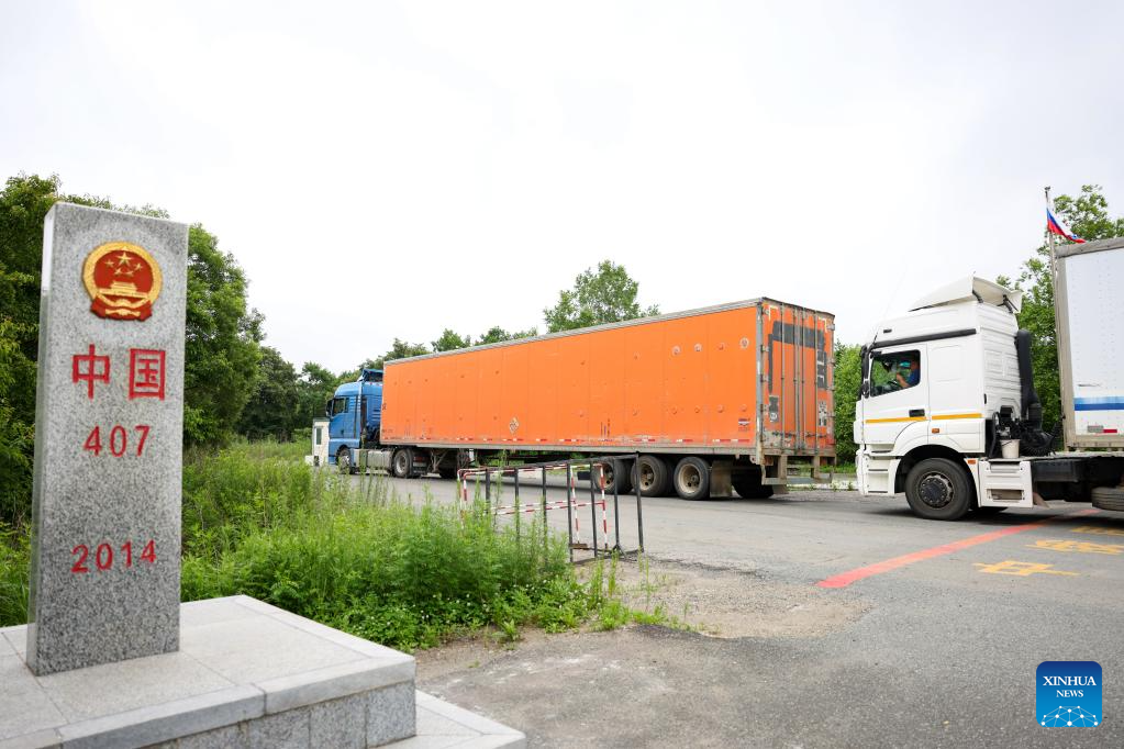 Trucks leave for Russia at the highway port in Hunchun City, northeast China's Jilin Province, June 26, 2023. Hunchun borders Russia and the Democratic People's Republic of Korea, and serves as the only port city of Jilin Province to Russia. More than 73,000 counts of persons and over 16,000 counts of vehicles have passed through the Hunchun highway port so far this year. (Xinhua/Yan Linyun)