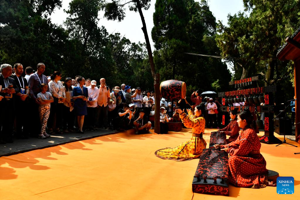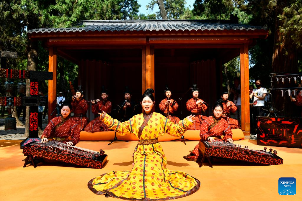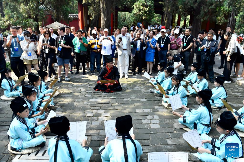 Performers are seen at the Confucius Temple in Qufu, east China's Shandong Province, June 27, 2023. A series of activities to promote traditional Chinese culture were held at the Confucius Temple in Qufu during the World Internet Conference Nishan Dialogue on Digital Civilization on Tuesday. (Xinhua/Guo Xulei)