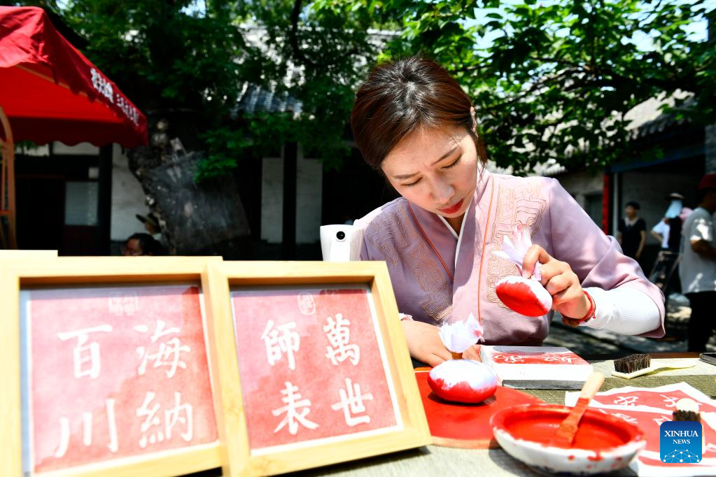 A staff member demonstrates rubbing production at the Confucius Temple in Qufu, east China's Shandong Province, June 27, 2023. A series of activities to promote traditional Chinese culture were held at the Confucius Temple in Qufu during the World Internet Conference Nishan Dialogue on Digital Civilization on Tuesday. (Xinhua/Guo Xulei)