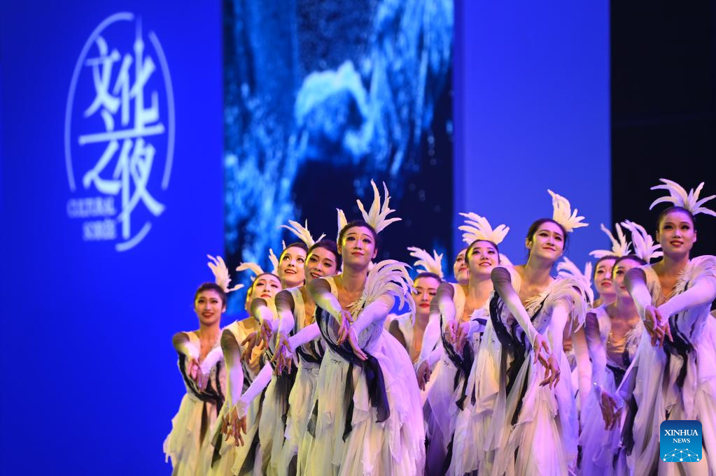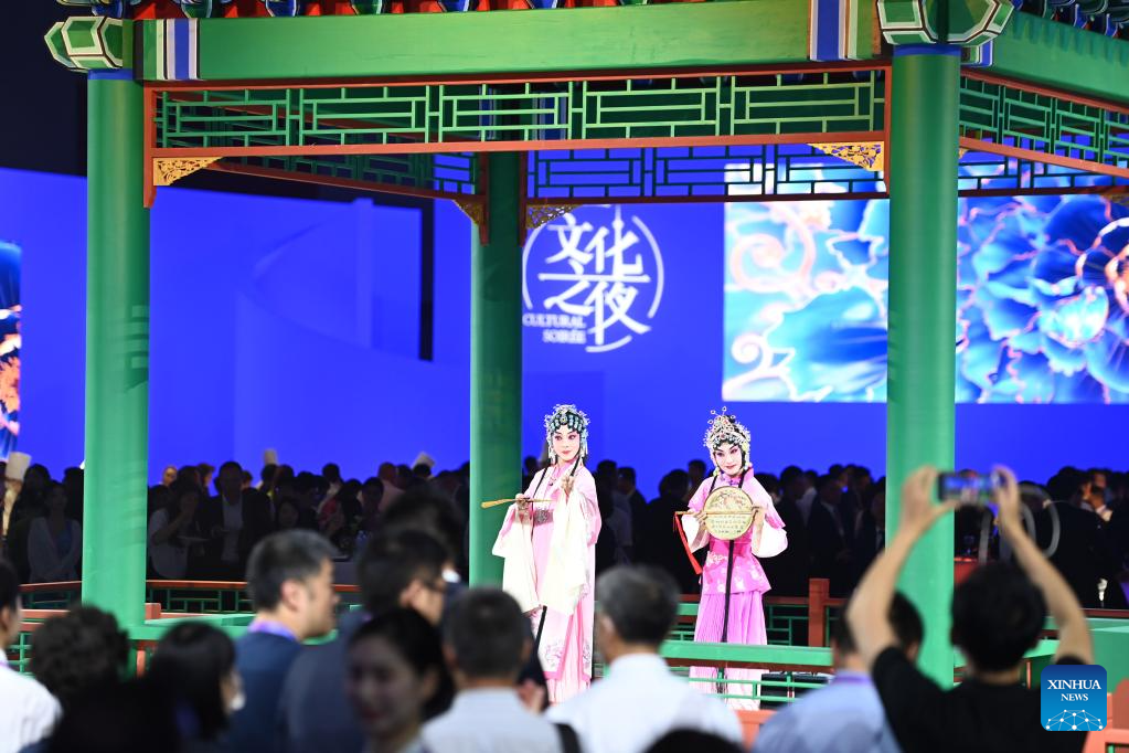 A performance is staged during the Cultural Soiree of the 14th Annual Meeting of the New Champions, also known as the Summer Davos, in north China's Tianjin Municipality, June 27, 2023. The cultural soiree was held at Tianjin Meijiang Convention Center on Tuesday night. Attendees tasted characteristic food of Tianjin and learned about traditional Chinese culture while enjoying performances during the event. (Xinhua/Zhao Zishuo)