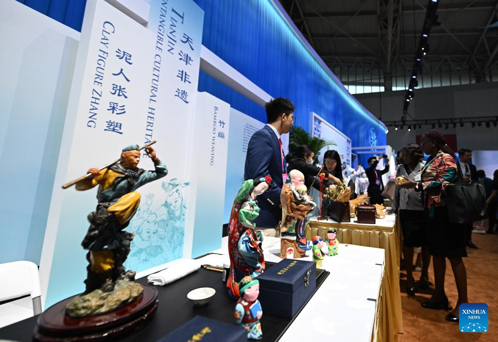 Guests learn about intangible cultural heritages of Tianjin during the Cultural Soiree of the 14th Annual Meeting of the New Champions, also known as the Summer Davos, in north China's Tianjin Municipality, June 27, 2023. The cultural soiree was held at Tianjin Meijiang Convention Center on Tuesday night. Attendees tasted characteristic food of Tianjin and learned about traditional Chinese culture while enjoying performances during the event. (Xinhua/Zhao Zishuo)