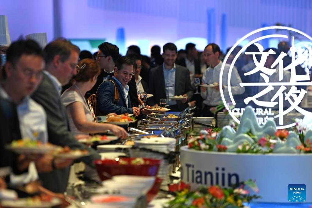 Guests enjoy the buffet dinner during the Cultural Soiree of the 14th Annual Meeting of the New Champions, also known as the Summer Davos, in north China's Tianjin Municipality, June 27, 2023. The cultural soiree was held at Tianjin Meijiang Convention Center on Tuesday night. Attendees tasted characteristic food of Tianjin and learned about traditional Chinese culture while enjoying performances during the event. (Xinhua/Zhao Zishuo)