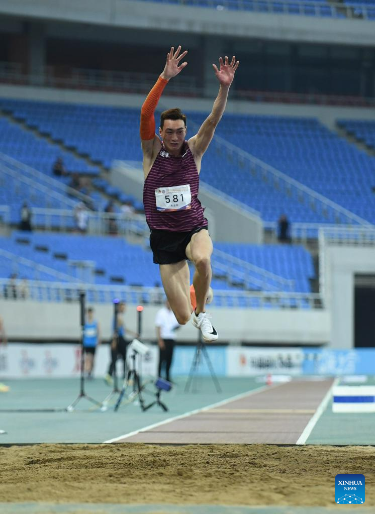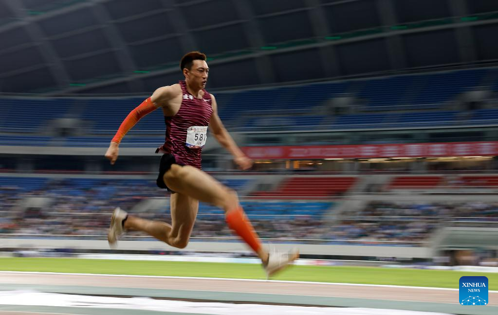 First-placed Zhu Yaming of Liaoning competes during the men's triple jump final at the 2023 China's National Athletics Championships, a qualification trial for World Athletics Championships Budapest 23 and the Hangzhou Asian Games in Shenyang, northeast China's Liaoning Province, June 27, 2023. (Xinhua/Long Lei)