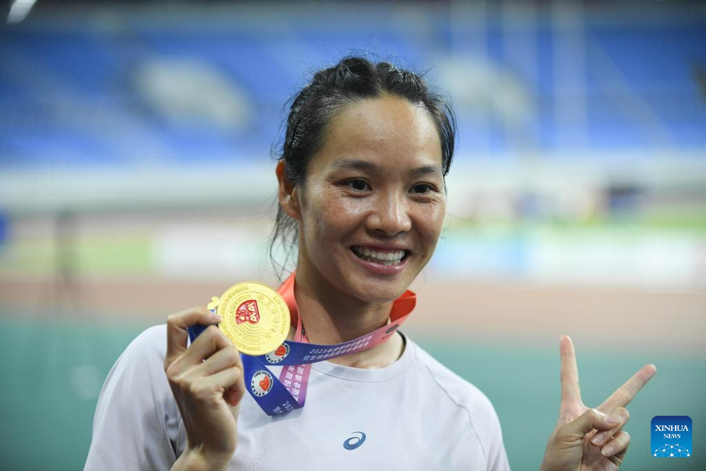 Gold medalist Wei Yongli of Guangxi poses for photos during the awarding ceremony of the women's 100m final at the 2023 China's National Athletics Championships, a qualification trial for World Athletics Championships Budapest 23 and the Hangzhou Asian Games in Shenyang, northeast China's Liaoning Province, June 27, 2023. (Xinhua/Long Lei)