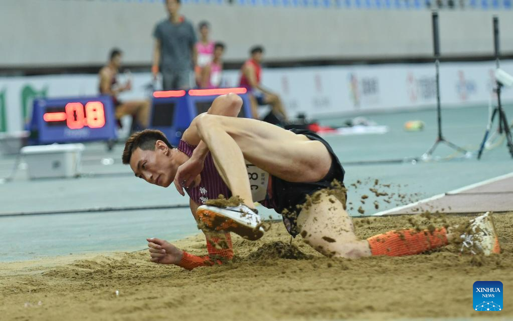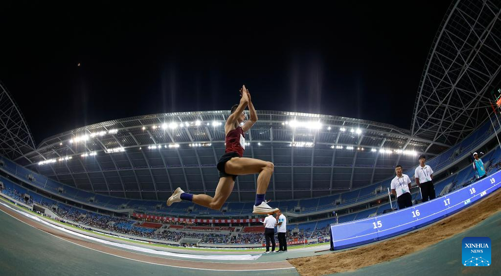 Second-placed Su Wen of Shanghai competes during the men's triple jump final at the 2023 China's National Athletics Championships, a qualification trial for World Athletics Championships Budapest 23 and the Hangzhou Asian Games in Shenyang, northeast China's Liaoning Province, June 27, 2023. (Xinhua/Wang Lili)