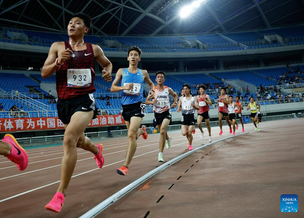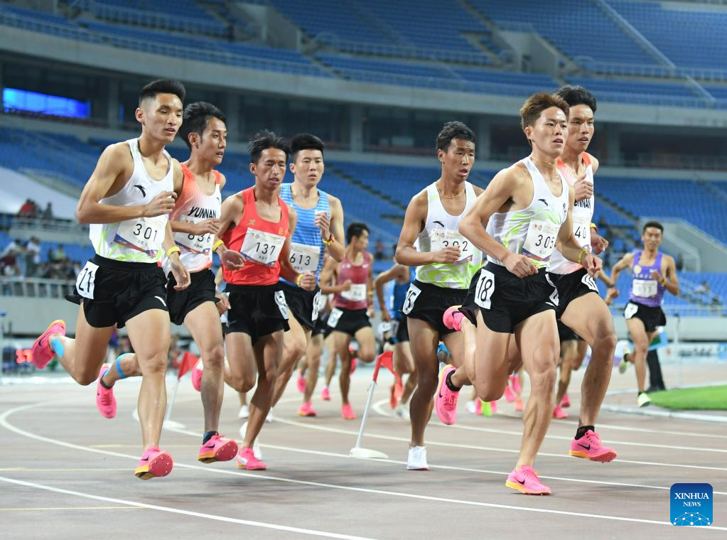 Athletes compete during the men's 5000m final at the 2023 China's National Athletics Championships, a qualification trial for World Athletics Championships Budapest 23 and the Hangzhou Asian Games in Shenyang, northeast China's Liaoning Province, June 27, 2023. (Xinhua/Long Lei)
