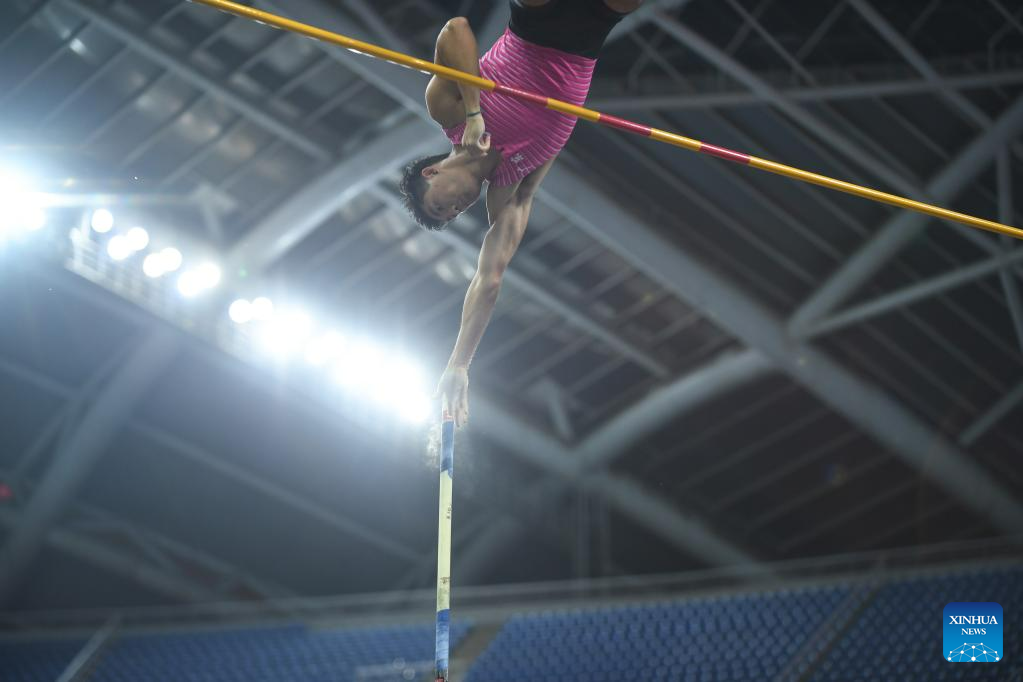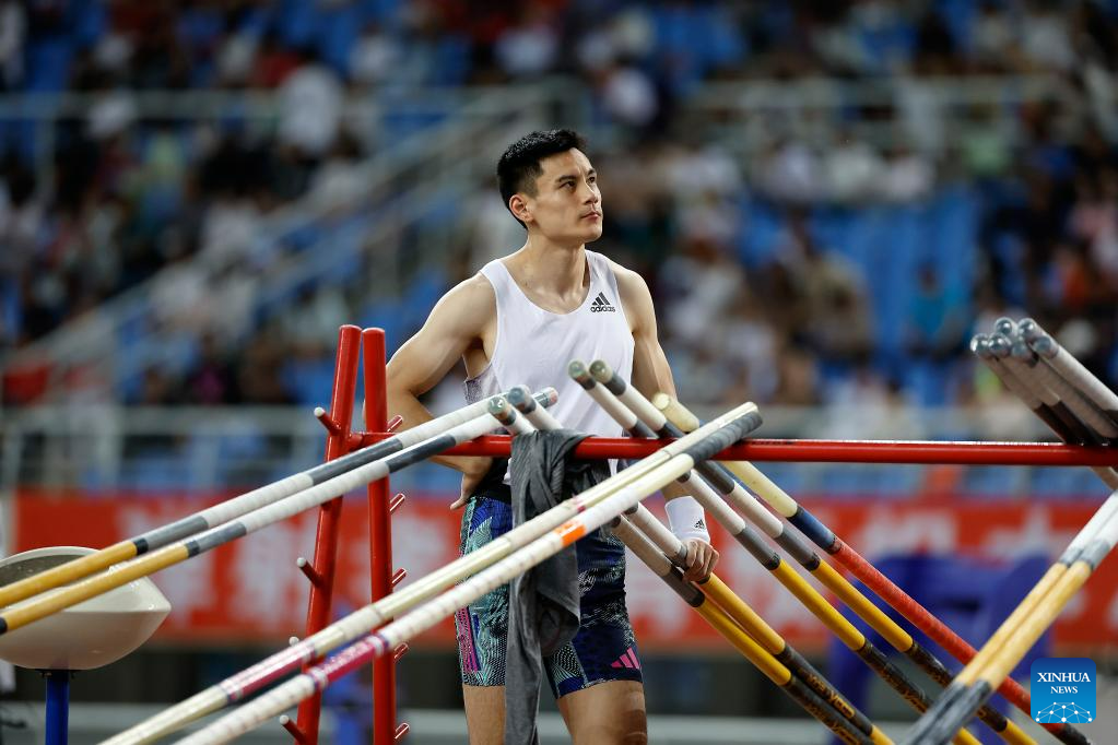 Second-placed Huang Bokai of Guangdong competes during the men's pole vault final at the 2023 China's National Athletics Championships, a qualification trial for World Athletics Championships Budapest 23 and the Hangzhou Asian Games in Shenyang, northeast China's Liaoning Province, June 27, 2023. (Xinhua/Long Lei)