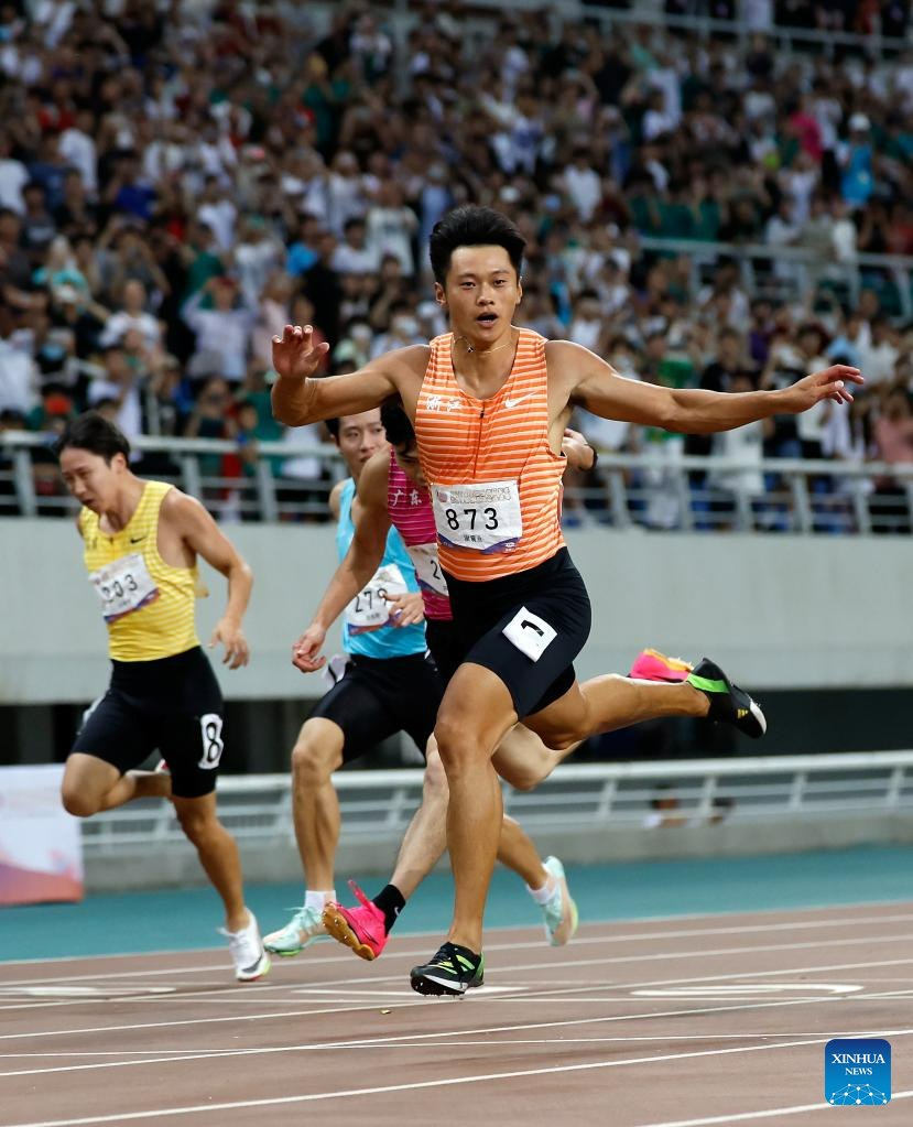 First-placed Xie Zhenye (front) of Zhejiang crosses the finish line during the men's 100m final at the 2023 China's National Athletics Championships, a qualification trial for World Athletics Championships Budapest 23 and the Hangzhou Asian Games in Shenyang, northeast China's Liaoning Province, June 27, 2023. (Xinhua/Wang Lili)