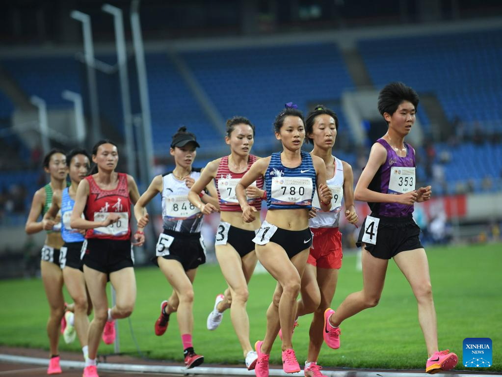 Athletes compete during the women's 5000m final at the 2023 China's National Athletics Championships, a qualification trial for World Athletics Championships Budapest 23 and the Hangzhou Asian Games in Shenyang, northeast China's Liaoning Province, June 27, 2023. (Xinhua/Long Lei)