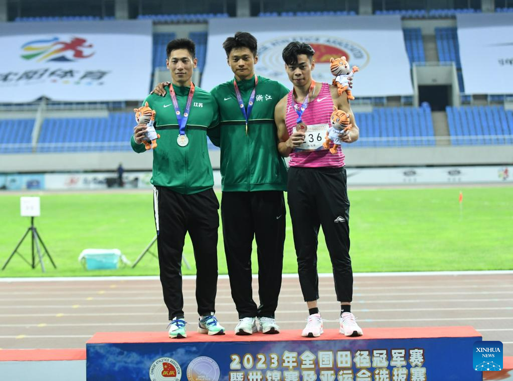 Gold medalist Xie Zhenye (C) of Zhejiang, silver medalist Shi Yuhao (L) of Jiangsu and bronze medalist Chen Guanfeng of Guangdong pose for photos during the awarding ceremony of the men's 100m final at the 2023 China's National Athletics Championships, a qualification trial for World Athletics Championships Budapest 23 and the Hangzhou Asian Games in Shenyang, northeast China's Liaoning Province, June 27, 2023. (Xinhua/Long Lei)