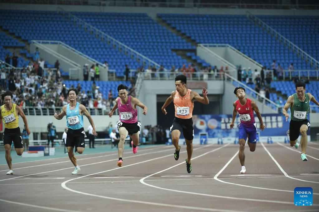 First-placed Xie Zhenye (3rd R) of Zhejiang crosses the finish line during the men's 100m final at the 2023 China's National Athletics Championships, a qualification trial for World Athletics Championships Budapest 23 and the Hangzhou Asian Games in Shenyang, northeast China's Liaoning Province, June 27, 2023. (Xinhua/Long Lei)