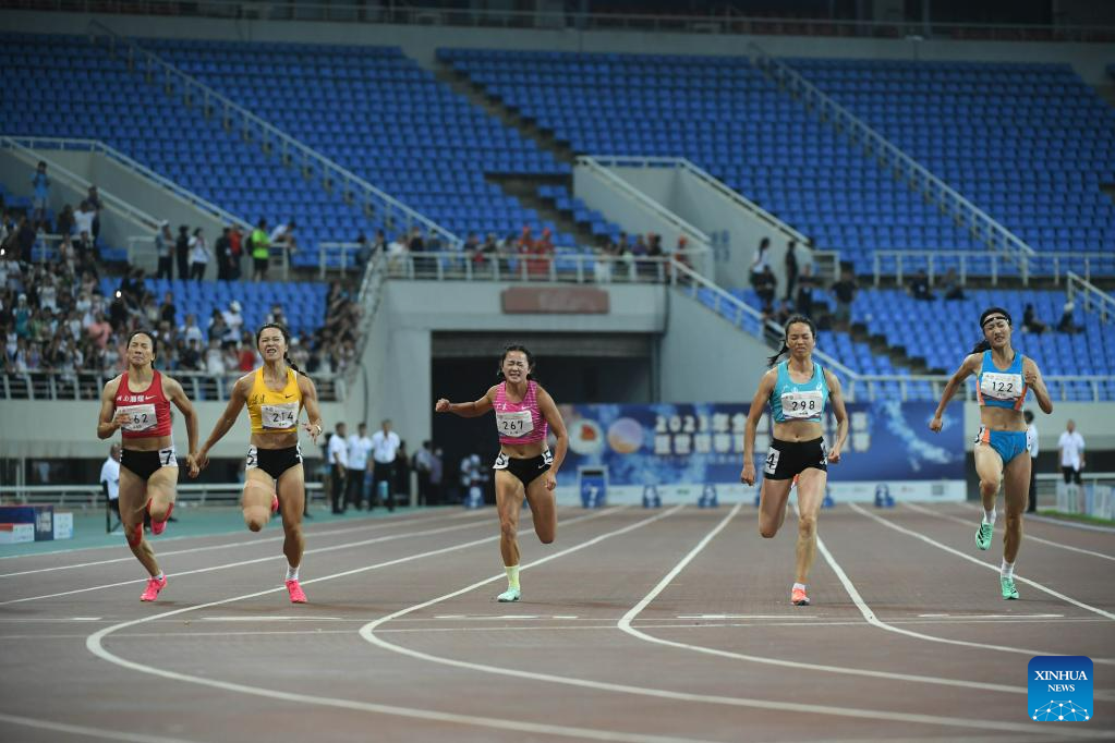 First-placed Wei Yongli (2nd R) of Guangxi crosses the finish line during the women's 100m final at the 2023 China's National Athletics Championships, a qualification trial for World Athletics Championships Budapest 23 and the Hangzhou Asian Games in Shenyang, northeast China's Liaoning Province, June 27, 2023. (Xinhua/Long Lei)